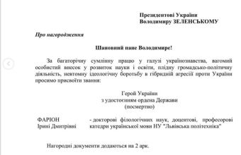 ЛОВА скерувала офіційний лист президенту України Володимиру Зеленському з клопотанням про присвоєння мовознавиці Ірині Фаріон звання Герой України.