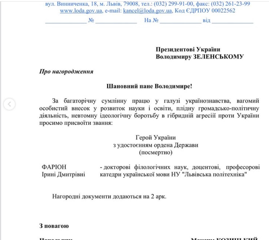 «24 липня 2024 року, завдяки Михайлу Шевелюку Михайло Шевелюк та Оксані Микитюк, була зареєстрована петиція про присвоєння Ірині Фаріон звання Героя України (посмертно). Попри блокування, ще у вересні вона набрала необхідні 25 тисяч голосів. Тепер зроблено другий важливий крок: Львівська обласна військова адміністрація скерувала офіційний лист президенту України Володимиру Зеленському з клопотанням про присвоєння цього високого звання», – йдеться у повідомленні.фото: sofiya.osoba/Instagram