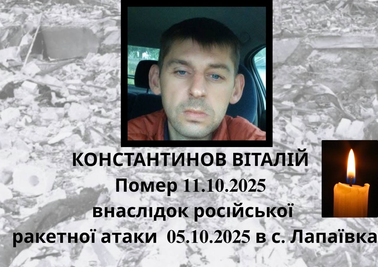 "Сьогодні, 11 жовтня, внаслідок російської ракетної атаки, відійшов у вічність житель села Лапаївка – Константинов Віталій Михайлович (07.01.1979 р.н.).