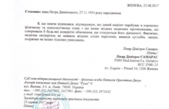 А тим часом сьогодні Петро Димінський, здійснюючи бізнес-візит до Женеви (так, саме ділову поїздку, а не «втечу», як її без суду і слідства намагаються подати фейсбук-міністри та фейсбук-радники, адже підзахисний має статус свідка і має право на вільне переміщення), пройшов медогляд у доктора медицини, лікаря Дімітроса Самараса.