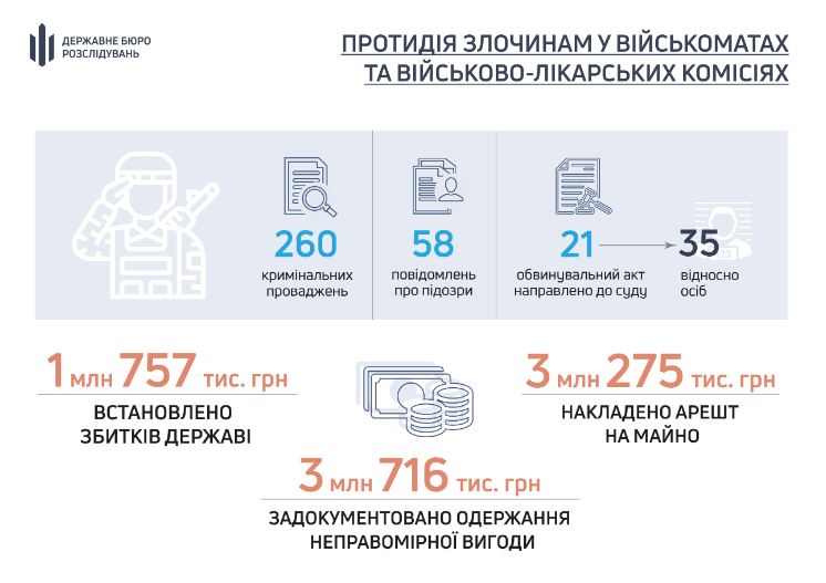 Державне бюро розслідувань займається 260 кримінальними провадженнями, пов'язаними із роботою територіальних центрів комплектування та соціальної підтримки (ТЦК та СП) і військово-лікарських комісій.