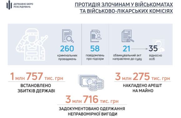 Державне бюро розслідувань займається 260 кримінальними провадженнями, пов'язаними із роботою територіальних центрів комплектування та соціальної підтримки (ТЦК та СП) і військово-лікарських комісій.