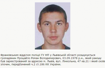 Франківський відділ поліції у Львові розшукує Романа Володимировича Процайла, який народився 3 вересня 1978 року, був зареєстрований у квартирі №21 будинку №47 на вулиці Лінкольна у Львові й скоїв злочин, передбачений частиною 2 статті 186 Кримінального кодексу України (грабіж). Всіх, кому що-небудь відомо про місце перебування розшукуваного злочинця, правоохоронці просять терміново повідомити у Франківський відділ поліції у Львові за телефонами 8(032)238-95-51 або 102. Про це повідомили сьогодні, 3 березня, у Львівському обласному управлінні поліції, де також опублікували фото розшукуваного.