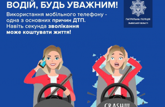 Про це повідомили в середу, 14 серпня, в управлінні Патрульної поліції Львівської області, де також розповіли: «Користування водіями засобамизв’язку під час руху є однією з найпоширеніших причин ДТП, саме тому про це слід пам’ятати! Відповідно до пункту Правил дорожнього руху 2.9 д) «Водієві забороняється, під час руху транспортного засобу користуватися засобами зв’язку, тримаючи їх у руці», а за невиконання цього правила передбачена відповідальність у вигляді штрафу 425 гривень за частиною 2 статті 122 Кодексу України про адміністративні правопорушення».