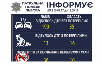 Львівські патрульні зареєстрували з 8 до 15 вересня 190 ДТП та оштрафували 36 п’яних водіїв. Про це повідомили сьогодні, 15 вересня, на сторінці управління патрульної поліції у Львові в інтернет-мережі «Facebook»