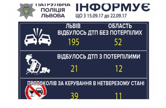 Працівники управління патрульної поліції у Львові зареєстрували з 15 до 22 вересня 195 ДТП.