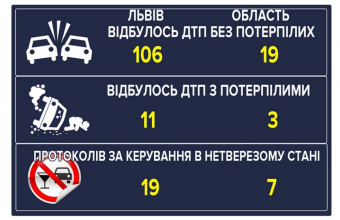 На сторінці управління патрульної поліції Львова в інтернет-мережі «Facebook» повідомили сьогодні, 10 березня, що її інспектори зареєстрували зі 6 до 10 березня 106 ДТП, оштрафувавши при цьому 19-х нетверезих водіїв.