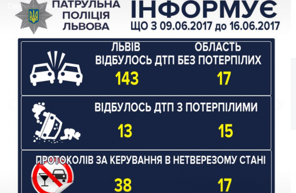 Працівники управління патрульної поліції у Львові оштрафували з 9 до 16 червня 38 нетверезих водіїв.