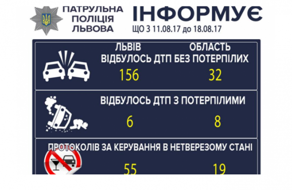 Львівські патрульні зареєстрували з 11 до 18 серпня 156 ДТП, а оштрафували 55 нетверезих водіїв. Про це повідомили сьогодні, 18 серпня, на сторінці управління патрульної поліції у Львові в інтернет-мережі «Facebook».