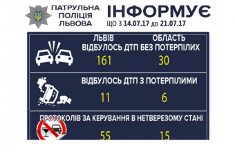 Львівські патрульні зареєстрували 14-21 липня 161 ДТП, а оштрафували 55 нетверезих водіїв. Про це повідомили на сторінці управління патрульної поліції у Львові в інтернет-мережі «Facebook».