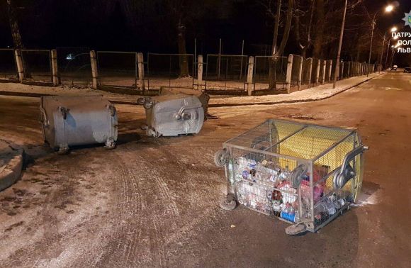 У патрульній поліції Львова повідомили сьогодні, 13 грудня, що вночі її працівники натрапили на вулиці Дозвільній на перекинуті сміттєві баки, які подекуди лежали на проїзній частині. А коли інспектори підійшли ближче, то побачили молодиків, які перекидали інші смітники.