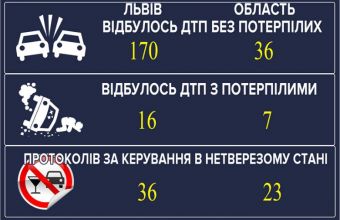 В управлінні патрульної поліції Львівської області повідомили в п’ятницю, що його працівники зареєстрували з 21 до 28 вересня на Львівщині 206 ДТП, 170 із яких сталися у Львові, й зупинили 59 п’яних водіїв, 36 із яких – у Львові.