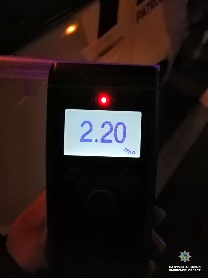В управлінні патрульної поліції Львівської області повідомили в понеділок, 28 січня: «Вчора, близько опівночі, екіпаж патрульних виявив на вулиці Науковій дорожньо-транспортну пригоду, за участі автомобілів «Mazda» та «Volkswagen». Водій автівки «Mazda», не дотримався безпечної дистанції та здійснив зіткнення з автомобілем попереду. Крім цього, під час спілкування з винуватцем ДТП, патрульні побачили ознаки алкогольного сп’яніння. Перевірка на приладі «Drager» показала результат 2.20 проміле, це в 11 разів вище допустимої норми. На водія склали всі необхідні адміністративні матеріали».