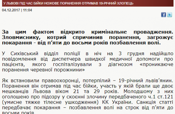 У Львівському обласному управлінні поліції розповіли сьогодні, 4 грудня, що в ніч на 3 грудня в його Сихівський відділ надійшло повідомлення від диспетчера швидкої медичної допомоги про пацієнта, якого госпіталізували з діагнозом «проникаюче поранення черевної порожнини» Як встановили правоохоронці, потерпілий – 19-річний львів’янин.