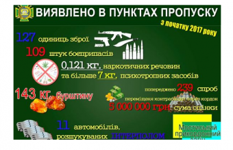 «Стабільно високими були результати по протидії незаконному переміщенню через кордон зброї, боєприпасів, наркотичних та психотропних речовин. У в пунктах пропуску було виявлено 127 одиниць зброї (значна частина з них – це холодна та травматична зброя), 109 штук боєприпасів, понад 0,121 кілограми наркотичних речовин та більше 7 кілограм психотропних засобів», – поінформували також у регіональному управлінні ДПСУ.