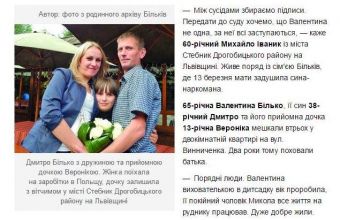«60-річний Михайло Іваник з міста Стебник у Дрогобицькому районі на Львівщині, який живе поряд із сім'єю Більків, де 13 березня мати задушила сина-наркомана, розповів: «Між сусідами збираємо підписи. Передати до суду хочемо, що Валентина не одна, за неї всі заступаються».