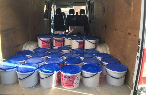 Також встановлено і місце виготовлення поліграфії. Вапняну сумішp з водою та піском розмішували у баках, а потім пакували у поліетиленові будівельні відра по шість та 12 кг.