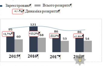 «Розкрито таких злочинів 54 (у 2017 році розкрито 53, динаміка розкриття +1,9 %)», – поінформували також в обласному управлінні поліції.