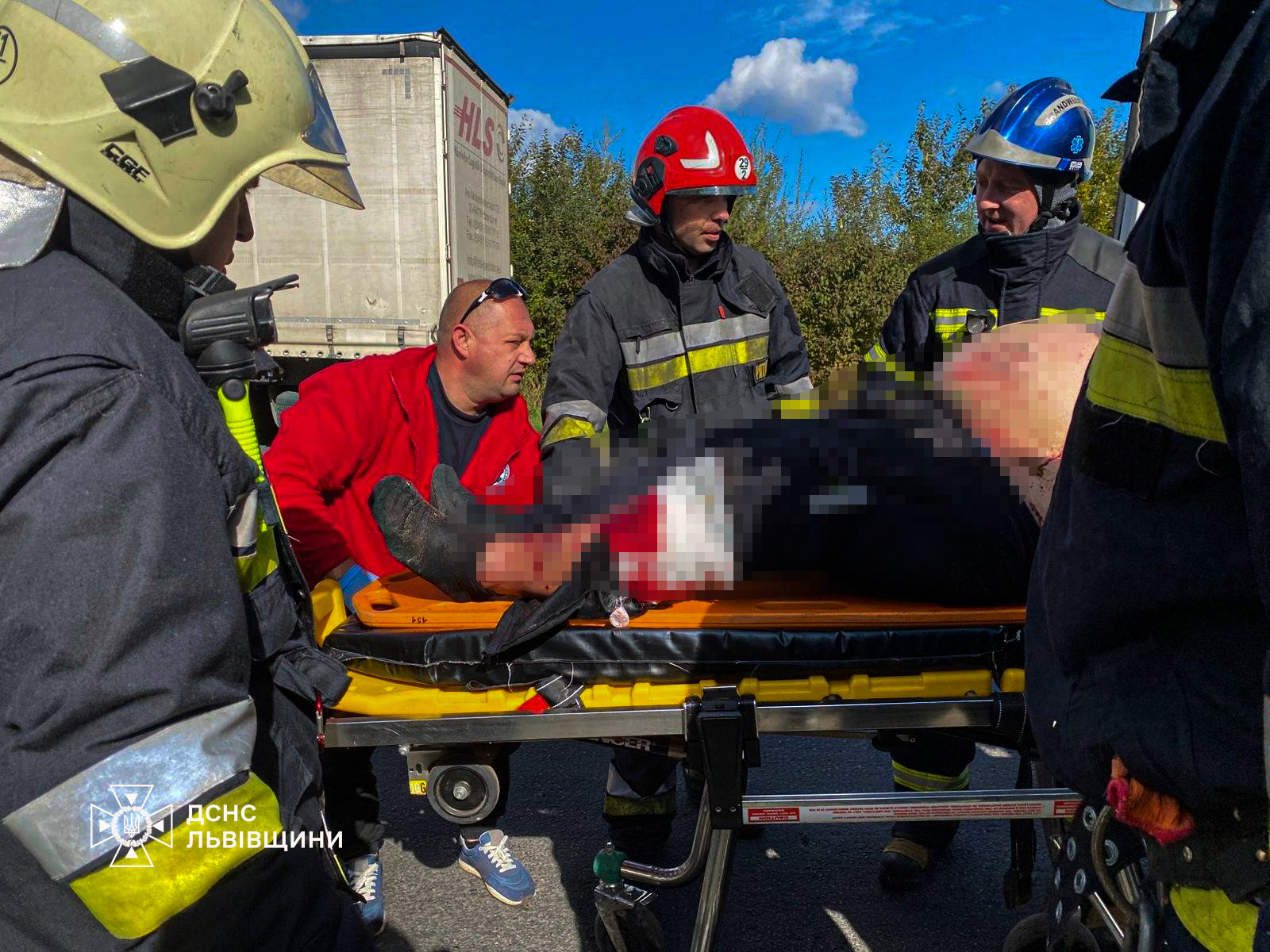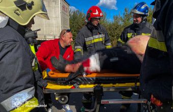 Рятувальники, що працювали на місці події, наклали травмованому турнікет на ногу, деблокували його з кабіни та на твердих ношах транспортували до карети швидкої допомоги.