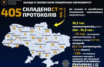 Про це повідомили в п’ятницю, 20 березня, в Головному управлінні поліції у Львівській області, де також розповіли: «Правоохоронці склали 405 адміністративних протоколів за статтею 44-3 (порушення правил щодо карантину людей) Кодексу України про адміністративні правопорушення. Найбільше порушень виявлено на Дніпропетровщині. Зокрема поліцейські склали 75 адмінпротоколів».