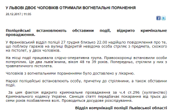 У Львівському обласному управлінні поліції розповіли в четвер, 28 грудня, що вчора близько 22.00 в його Франківський відділ надійшло повідомлення про те, що невідомий стріляє поблизу гаражів на вулиці Відкритій у двох чоловіків.з предмета, схожого на пістолет. Правоохоронці встановили особи потерпілих – це два львів’янина віком 48 та 39 років