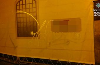 В управлінні патрульної поліції Львова повідомили в понеділок, 26 червня, що сьогодні близько четвертої години ранку до її працівників звернувся свідок розмалювання двома чоловіками декоративної сітки на будівельних риштуваннях, які закривали фасад будинку навпроти Львівської міської ради. Оскільки заявник відзняв порушників на відео, інспектори отримали їх чіткі описи й вже неподалік, на вулиці Підвальній, затримали двох перехожих.