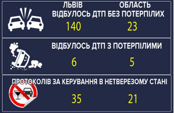 В управлінні патрульної поліції у Львівській області повідомили в п’ятницю, що його працівники зареєстрували з 30 березня до 6 квітня на Львівщині 163 ДТП, 140 із який сталися у Львові, а також зупинили 54 п’яних водіїв, 35 із яких у Львові.