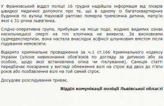 У Львівському обласному управлінні поліції повідомили сьогодні, 22 грудня: «У Франківський відділ поліції 16 грудня надійшла інформація від лікарів швидкої медичної допомоги про те, що в одному із багатоквартирних будинків на вулиці Науковій раптово померла тримісячна дитина, матір’ю якої є 31-річна львів’янка. Слідчо-оперативна група, прибувши на місце події, жодних видимих ознак насильницької смерті на тілі хлопчика не виявила».