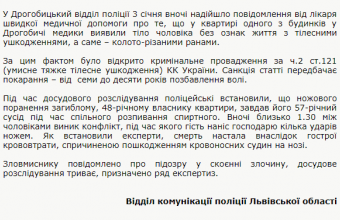 У Львівському обласному управлінні поліції розповіли сьогодні, 4 січня, що вчора вночі в його Дрогобицький відділ надійшло повідомлення від лікаря швидкої медичної допомоги про те, що у квартирі одного з будинків у Дрогобичі медики виявили тіло чоловіка без ознак життя з тілесними ушкодженнями – колото-різаними ранами. За цим фактом було відкрито кримінальне провадження за частиною 2 статті 121 (умисне тяжке тілесне ушкодження) Кримінального кодексу України, яка передбачає від семи до десяти років позбавлення волі.