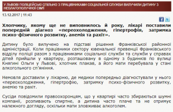 Сусіди повідомили правоохоронцям, що у квартирі часто збираються шумні компанії, розпивають спиртне, а дитина часто плаче та не отримує належного догляду, оскільки мати зловживає алкоголем. Після обстеження та лікування хлопчик буде поміщений в один із львівських дитячих будинків. Наразі вирішується питання про відкриття кримінального провадження», – поінформували також у прес-службі Львівського обласного управління поліції.