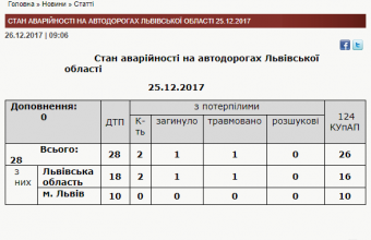 У понеділок, 20 грудня, на дорогах Львівщини були зафіксовані 28 дорожньо-транспортних пригод, унаслідок яких загинула одна людина, а ще одна була травмована.