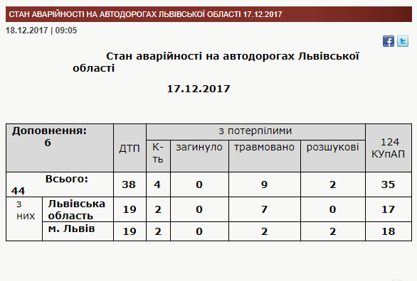 У неділю, 17 грудня, на дорогах Львівщини були зафіксовані 44 дорожньо-транспортні пригоди, в тому числі 19 – у Львові.