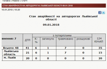 У вівторок, 9 січня, на дорогах Львівщини були зафіксовані 48 дорожньо-транспортні пригоди, унаслідок яких загинула одна людина й були травмовані семеро.