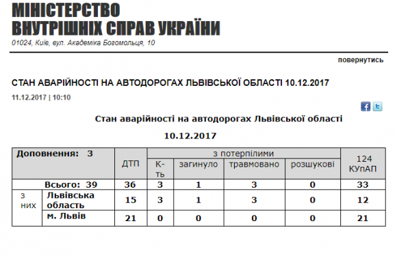 У неділю, 10 грудня, на дорогах Львівщини були зафіксовані 39 дорожньо-транспортні пригоди, 21 із них – у Львові.
