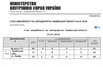 У середу, 24 січня, на дорогах Львівщини були зафіксовані 51 ДТП, унаслідок яких травмувалися п’ятеро людей.