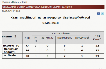 У вівторок, 2 січня, на дорогах Львівщини були зафіксовані 60 дорожньо-транспортних пригод, унаслідок яких були травмовані дев’ятеро людей.