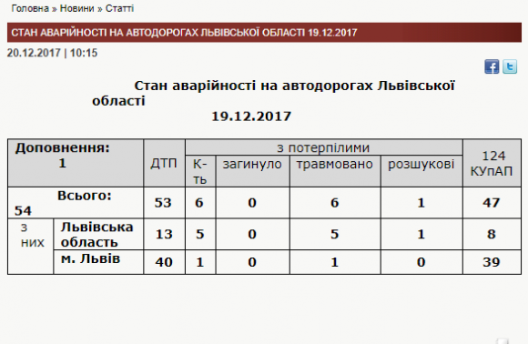 Про це повідомили в середу, 20 грудня, в прес-службі Львівського обласного управління поліції, де також розповіли, що, зокрема, у Львові вчора були зафіксовані 40 ДТП, а травмувалася одна людина.