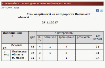 У Львівському обласному управлінні поліції повідомили у вівторок, 28 листопада, що вчора його працівники зареєстрували на дорогах Львівщини 75 ДТП, унаслідок яких одна людина загинула, а четверо були травмовані. Зокрема, у Львові поліціянти зафіксували 42 ДТП., унаслідок яких була травмована одна людина. Як інформував «ЩЛ», вчора на Львівщині загинула внаслідок ДТП пасажир автомобіля.