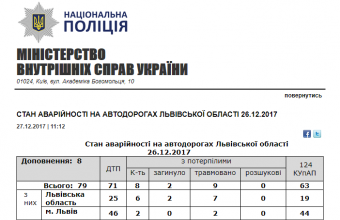 Про це повідомили у середу, 27 грудня, в прес-службі Львівського обласного управління поліції, де також розповіли, що, зокрема, у Львові вчора були зафіксовані десять ДТП, унаслідок яких були травмовані двоє людей. Як інформував «ЩЛ», на дорозі Львів-Ужгород загинули внаслідок зіткнення водій і пасажир легковика.