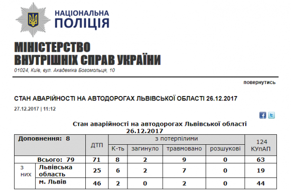 У вівторок, 26 грудня, на дорогах Львівщини були зафіксовані 79 дорожньо-транспортних пригод, унаслідок яких загинули дві людина, а дев’ятеро були травмовані.