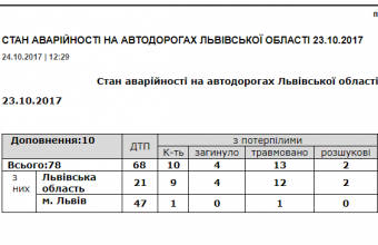 У Львівському обласному управлінні поліції повідомили сьогодні, 24 жовтня, що вчора на дорогах Львівщини сталися 78 ДТП, унаслідок яких загинули четверо людей, а ще 13 були травмовані. Зокрема, у Львові поліціянти зареєстрували в понеділок, 23 жовтня, 47 ДТП, унаслілок яких загинула одна людина, а ще одна була травмована. Як інформував «ЩЛ», четверо людей загинули вчора на дорогах Львівщини.