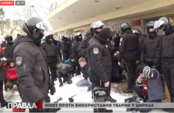 Про це повідомили на порталі оперативних новин «Varta1», де також розповіли: «На акцію прийшла група людей у балаклавах з ножами та молотками, яких затримали працівники поліції. На даний час ситуацію біля цирку контролюють працівники поліції».