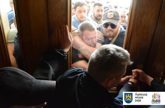 У Головному управлінні поліції у Львівській області повідомили в п’ятницю: «У середу, 29 травня, об 11.12 на оперативну лінію 102 надійшло повідомлення про те, що на площі Ринок група осіб, зламавши замок вхідних дверей, пройшли у приміщення Львівської міської ради. Об 11.19 за вказаною адресою прибули екіпажі Управління патрульної поліції у Львівській області, співробітники батальйону поліції особливого призначення поліції Львівщини, а згодом – слідчо-оперативна група Галицького відділу поліції».