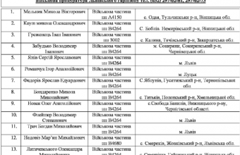У прес-службі військової прокуратури Західного регіону України опублікували сьогодні, 27 липня, «Перелік військовослужбовців, щодо яких військовими прокуратурами гарнізонів Західного регіону України здійснюється досудове розслідування за фактами самовільного залишення військових частин та місць служби (дані станом на 26 липня 2017», а також повідомили: «З метою встановлення об’єктивних обставин та поважності причин залишення військових частин та місць служби звертаємось до громадян з проханням допомогти встановити місце знаходження наступних осіб. З виниклих питань або будь-якої інформації, яка допоможе у з’ясуванні зазначених обставин, просимо звертатися у військові прокуратури гарнізонів Західного регіону України за вказаними в таблиці номерами телефонів».