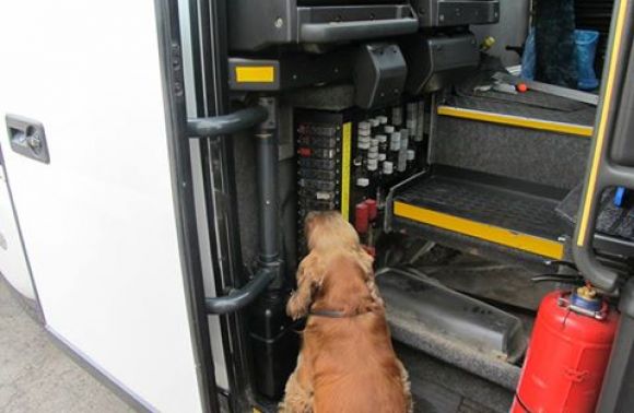 Службовий собака Барон винюхав контрабандні цигарки у спеціальному сховку в паливного баку автобуса.