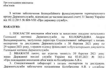 Наказом Державної митної служби України № 303-о від 29.03.2021 року «Про покладання обов’язків» покладено виконання обов’язків начальника Галицької митниці Держмитслужби на Колобродова Андрія Володимировича з 30 березня до 29 червня 2021 року, який займає посаду заступника директора Спеціалізованої лабораторії з питань експертизи та досліджень Держмитслужби.
