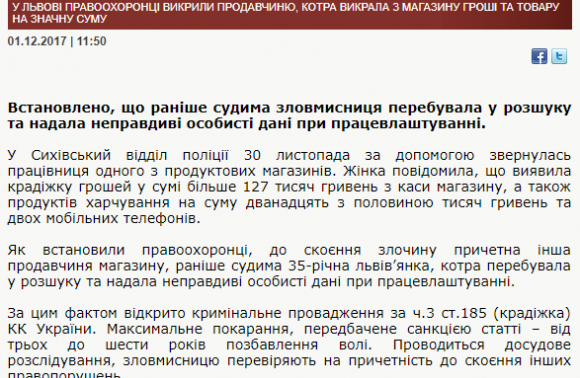 У п’ятницю, 30 листопада, в Сихівський відділ поліції звернулася за допомогою працівниця одного з продуктових магазинів, яка повідомила, що виявила крадіжку грошей у сумі більше 127 тисяч гривень з каси крамниці, а також продуктів харчування на суму дванадцять з половиною тисяч гривень і двох мобільних телефонів. Як встановили правоохоронці, до скоєння злочину причетна інша продавчиня магазину, раніше судима 35-річна львів’янка, котра перебувала у розшуку та надала неправдиві особисті дані при працевлаштуванні.