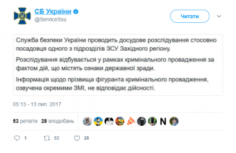 Про це повідомили сьогодні, 13 липня, на сторінці Міжнародного центру миротворчості та безпеки в інтернет-мережі «Facebook». Натомість на сторінці СБУ в інтернет-мережі «Facebook» поінформували: «Служба безпеки України проводить досудове розслідування стосовно посадовця одного з підрозділів ЗСУ Західного регіону. Розслідування відбувається у рамках кримінального провадження за фактом дій, що містять ознаки державної зради. Інформація щодо прізвища фігуранта кримінального провадження, озвучена окремими ЗМІ, не відповідає дійсності».