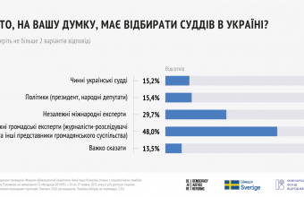 48% українців вважає, що відбирати суддів мають незалежні громадські експерти — журналісти-розслідувачі та інші представники громадянського суспільства. Трохи менше 30% таку роль відводить незалежним міжнародним експертам.