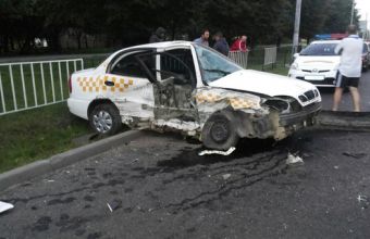 Водія таксі госпіталізовано, а п'яного винуватця ДТП за допомогою перехожих та працівників ДПС затримано і прикуто кайданками до огорожі, бо його поведінка була більш ніж неадекватною. Працює слідчо-опервтивна група. У водія таксі – травма голови.
